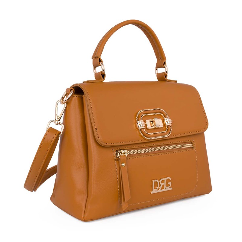 Women's Crossbody Bag, Camel. Eco-leather. It features 3 separate internal compartments, 1 internal zip pocket, and 1 external zip pocket on the front. Closes and secures with a metal fastening and zipper. Adjustable, detachable crossbody strap. Dimensions: H 20cm, W 26cm, D 12cm "Designed in Greece exclusively by De Raggi designers".
